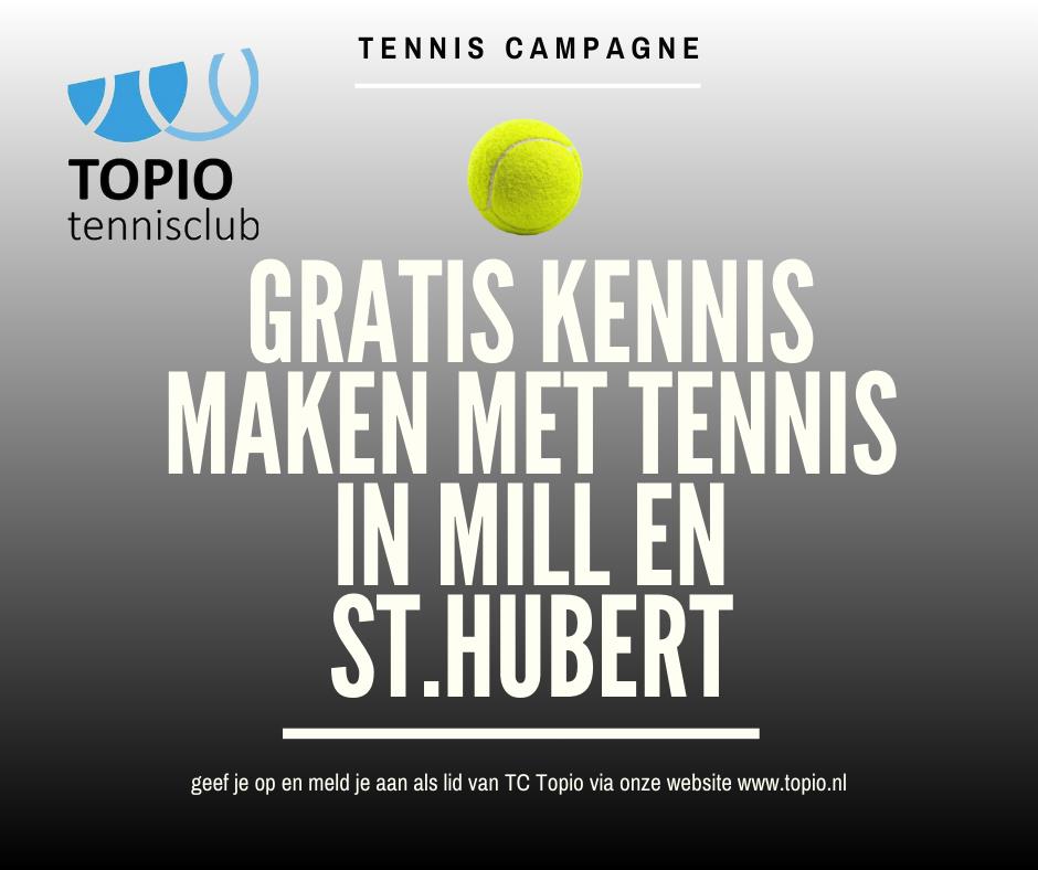 Omdat Topio extra ruimte heeft voor nieuwe leden gaan wij een kleine campagne starten. Het bestuur hoopt dat hierdoor de tennissport voor aspirant leden aantrekkelijk gemaakt kan worden. Proeven aan het tennisspel en nieuwe leden enthousiast maken voor deze sport! Daarom bieden wij 6 gratis trainingen in de eerste drie maanden van het jaar aan. Je kunt dan onder professionele leiding bekijken en trainen om lekker mee te kunnen tennissen en kijken of de club je bevalt.